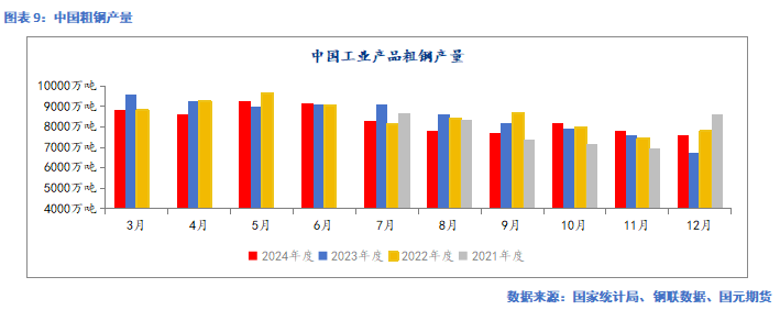 1月样本钢厂五大品种钢材周均产量为820.71万吨,较上月环比减少3.88%,同比下降5.34%。其中螺纹钢周均产量为199.57万吨,月环比下降8.83%;热轧卷板周均产量308.94万吨,月环比下降1.69%。中钢协数据显示,1月上旬粗钢日均产量在262.02万吨/天,较上月增加5.47%。根据铁水数据来看,1月粗钢产量延续环比下降。