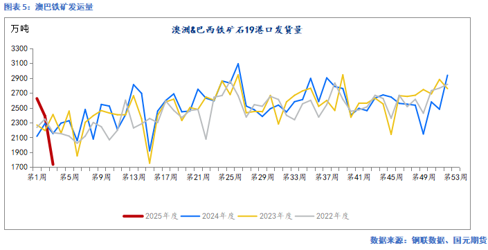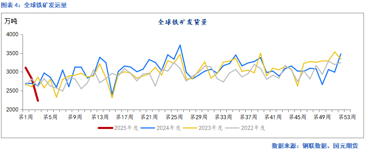 从四大矿山发运情况来看,截至1月17日,FMG在2025财年累计发运10581.9万吨,同比增加688.9万吨;BHP在2025财年累计发运16009.3万吨,同比增加267.9万吨;力拓年累计发运1586.2万吨,同比下降121.5万吨;淡水河谷年累计发运1281万吨,同比下降118.2万吨。