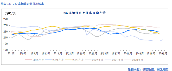 钢厂利润好于去年同期。截至1月17日,247家钢厂盈利率维持在50%附近,铁水产量224.68万吨/天,环比下降2.56%,较去年同期增加1.64%。由于螺纹钢产量及库存偏低,其利润与热卷利润基本相当。