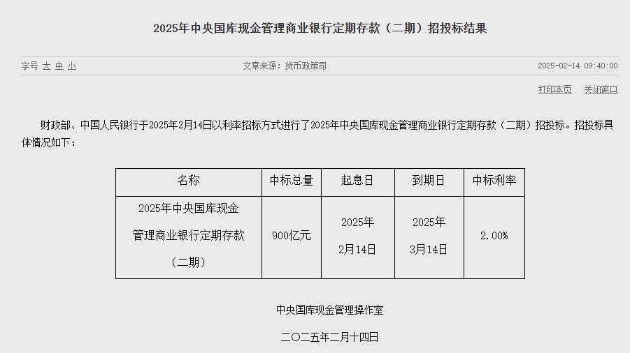 2月14日,央行官网公告称,财政部、中国人民银行于2025年2月14日以利率招标方式进行了2025年中央国库现金管理商业银行定期存款(二期)招投标,中标总量900亿元,中标利率2%,起息日为2025年2月14日,到期日为2025年3月14日。