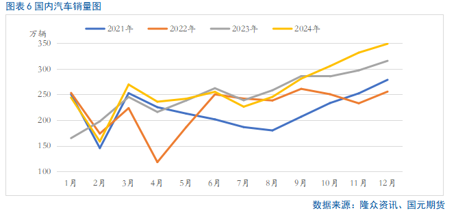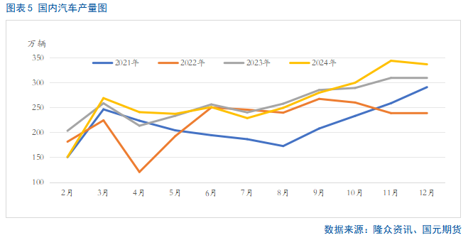 中汽协最新数据显示,2024年12月,我国汽车产销分别完成336.6万辆和348.9万辆,同比分别增长9.3%和10.5%。2024年汽车产销分别完成3128.2万辆和3143.6万辆,同比分别增长3.7%和4.5%,产销量再创新高,继续保持在3000万辆以上规模。市场需求的大幅增长主要归因于2024年持续并扩大的以旧换新政策、地方政府提供的补贴、企业的积极促销策略,以及出口表现的显著亮眼,这些因素共同强有力地推动了市场需求的扩张。进一步也提振市场心态。而国家发改委和财政部2025年1月8日发布了《关于2025年加力扩围实施大规模设备更新和消费品以旧换新政策的通知》,相信随着系列政策出台落地,政策组合效应不断释放,将会进一步释放汽车市场潜力,所以对于原料端天胶市场而言存在一定的支撑。