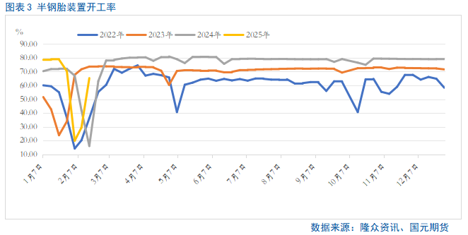 “元宵节”前下游轮胎企业多数仍处于停工放假阶段,因此近期需求端并未全面恢复。而春节前,下游多数企业在备货行为,因此在节后这两周需求端对其支撑有限。不过从“元宵节”后,下游市场将陆续恢复。据悉,截至2月13日,国内半钢胎样本企业产能利用率为65.28%,环比上涨52.64个百分点,同比上涨13.82个百分点。全钢胎样本企业产能利用率为54.29%,环比上涨41.04个百分点,同比上涨24.03个百分点。