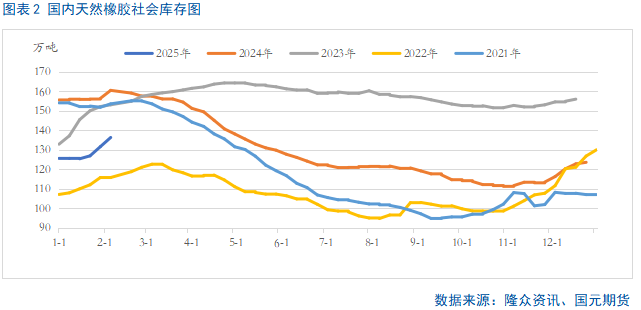 春节期间,尽管国内天然橡胶处于停割期,但是由于节前下游市场已完成备货,而“元宵节”前下游轮胎市场并未全面返市,因此导致下游采购不佳,国内天然橡胶社会库存呈现季节性累库格局。截至2025年2月9日,国内天然橡胶社会库存136.3万吨,环比增加4.6万吨,增幅达到3.5%。其中,深色胶社会总库存为79.3万吨,环比增加3.7%。浅色胶社会总库存为57万吨,环比增3.3%。