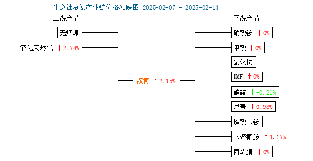 从液氨产业链图来看,液氨上下游环境略有改善,上游天然气摆脱了1月的低迷态势,本周价格上涨,涨幅在2.74%。另外,下游领域普遍回暖,这主要表现在下游需求刚性偏强,农业需求略有回温;另外,工业需求维持刚需为主。主要下游产品尿素(0.98%)。