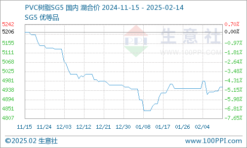 据生意社商品行情分析系统监测显示,本周(2.10-14)PVC现货市场逆转颓势,价格小幅反弹。截止周五,国内PVC电石法SG-5型均价4950元/吨,周内上涨0.73%。