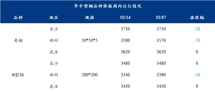 郑州:本周郑州型钢价格趋弱运行,周内期货盘面震荡下行,现货价格基本跟随钢厂出厂价格进行调整,市场参与者周内陆续开工,但终端开工率及资金到账情况不理想,采购意愿不明显,贸易商出货节奏也放缓。近期市场行情趋向于稳定,预计价格变动不明显。