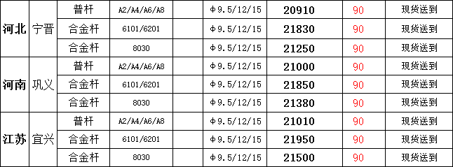 2月14日宁晋市场普铝杆现货报盘价20910元/吨,较上一交易日报价涨90元/吨;巩义市场普铝杆现货报盘价21000元/吨,较上一交易日报价涨90元/吨;宜兴市场普铝杆报盘价21010元/吨,较上一交易日报价涨90元/吨。