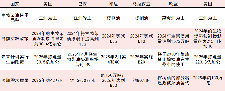 表4:2025年各国生物柴油政策对比 单位:万吨,加仑