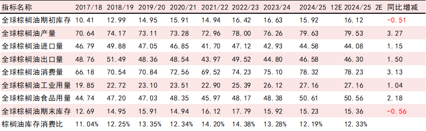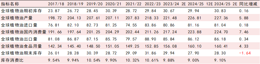 表5:2024/2025年全球植物油供需平衡表 单位:百万吨