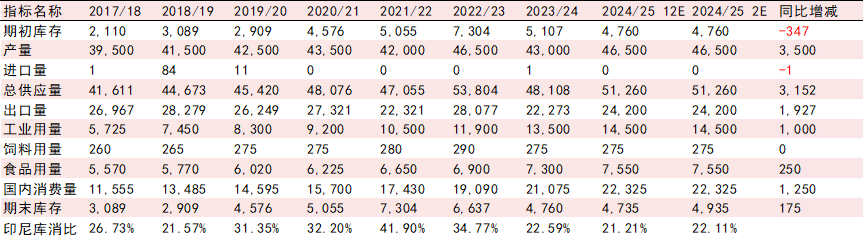 表2:2024/2025年印尼棕榈油供需平衡表 单位:千吨