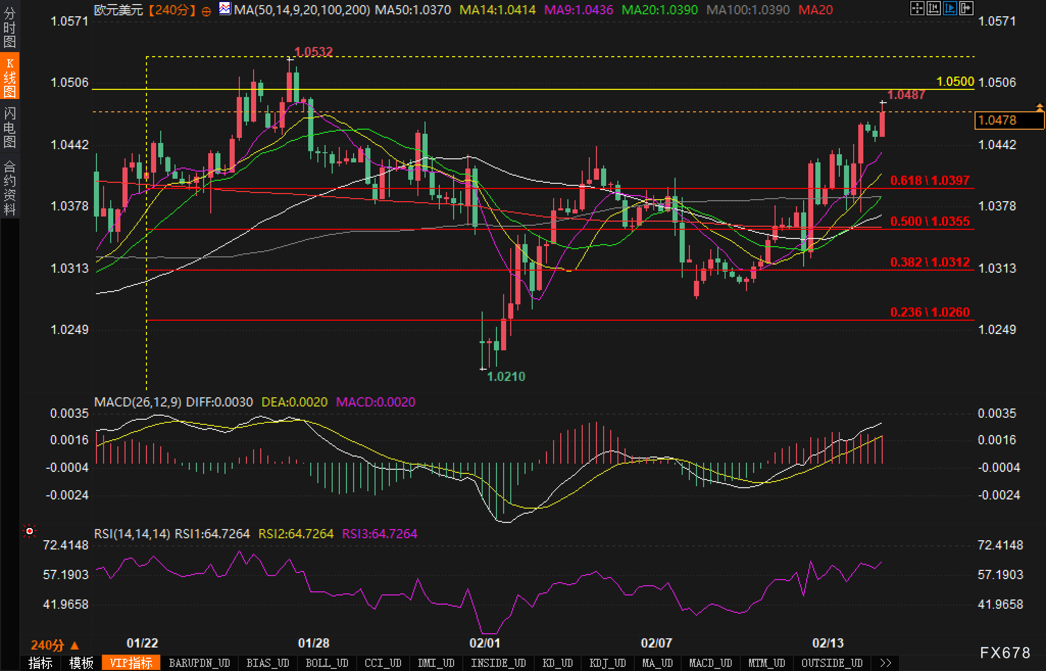 汇通财经APP讯——本周四,欧元/美元在美国交易时段的后半段呈现出强劲的上涨势头,单日上涨接近0.8%。进入周五(2月14日)亚洲时段,汇率突破了1.0470,创下自1月27日以来的新高,目前维持在1.0480附近。