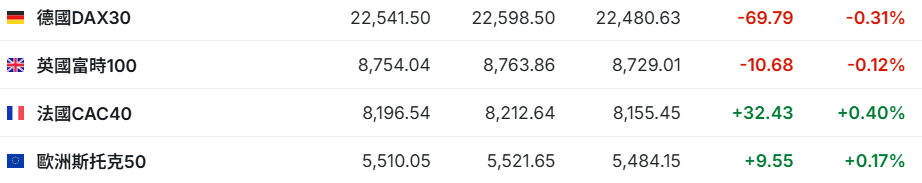2. 截至发稿,德国DAX指数跌0.31%,英国富时100指数跌0.12%,法国CAC40指数涨0.40%,欧洲斯托克50指数涨0.17%。