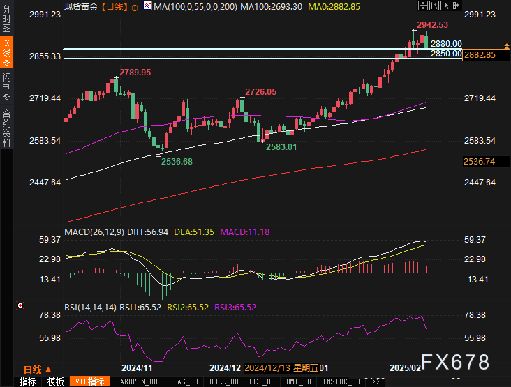 技术面上,金价的回调可能并不意味着趋势的反转,而是市场获利回吐后的短期调整。如果金价能够保持在2880美元/盎司以上,仍有望在短期内突破此前的历史新高。黄金的技术支撑位在2850美元附近,若失守此位置,可能会引发进一步的回调,但考虑到当前的基本面支撑,金价下行空间有限。