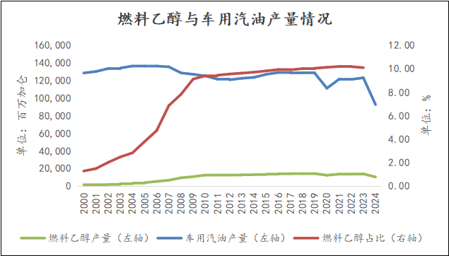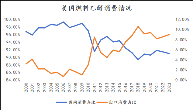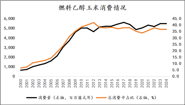 燃料乙醇是美玉米主要消费渠道之一。USDA数据显示,2011年-2024年,比例基本在35%-40%这个区间波动,2024年燃料乙醇消费占美国玉米总消费(包括出口)的36.4%。
