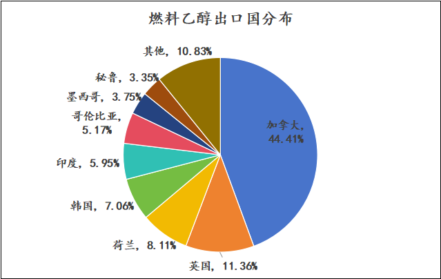 美国燃料乙醇消费主要分两块,一是国内消费,占比接近90%,二是出口消费,占比在10%左右。国内消费主要是与汽油混合用做车用燃料,结合燃料乙醇和汽油的产量数据来看,2000年-2010年燃料乙醇的掺混比例呈现逐步上升的态势,2010年的掺混比例9.13%,2010年-2020年燃料乙醇的掺混比例呈现缓慢增长的态势,2020年的掺混比例为10.02%,2021年-2024年燃料乙醇的掺混比例稳定在10%左右,2024年的掺混比例约为10.1%。出口消费来看,2000年-2010年呈现缓慢增长态势,同时出口消费在整体消费中的占比不超过3%,2011年受巴西减产的影响,美国燃料乙醇的出口市场份额快速提升,出口量增幅较大,2012年由于美国玉米减产的影响,美国燃料乙醇出口量有所收缩,2013-2019年在全球多个国家实施生物燃料掺混要求的影响下,其出口量继续逐步增长的态势,2020年之后,受新冠疫情的影响,燃料乙醇产业链呈现收缩态势,美国燃料乙醇出口量也高位回落。目前美国燃料乙醇的出口基本在14亿加仑左右。出口国分布来看,主要是加拿大、英国、荷兰、韩国、印度等国家。