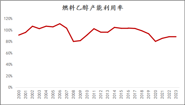 美国燃料乙醇产能呈现快速增长态势。2024年初,美国燃料乙醇产能为180亿加仑/年,相比2000年的17.8亿加仑/年增长9倍多,相比2010年的145亿加仑/年增长24.14%。美国燃料乙醇产能变化趋势可以分为四段,第一段是2005年以前,产能缓慢增长,第二段是2005年-2010年,产能快速增长,第三段是2011年-2015年,产能维持稳定,第四段是2016年-至今,产能小幅增长。2005年以后燃料乙醇产能的快速增长主要是受到了《能源政策法案》与《能源独立与安全法》的推动。2011年-2015年增速放缓主要是两方面原因,一是美国政府对于燃料乙醇的支持力度有所下降,二是原料玉米遭遇极端天气,价格上涨明显,导致燃料乙醇的利润明显收缩。2016年-至今,产能小幅增长的原因同样是两方面,一是全球环境问题日益突出,保护环境需求上升;二是原料玉米供应充裕,价格表现偏弱,小幅支撑燃料乙醇的利润。美国燃料乙醇产能分布来看,主要集中在玉米主产区,爱荷华州、内布拉斯加州、伊利诺伊州、南达科他州、明尼苏达州、印第安纳州的累计产能接近总产能的75%。产能利用率角度来看,2020年以前,产能利用率基本都是90%以上,2020年开始,产能利用率降至80%-90%这个区间,2023年产能利用率为88%,2024年1-10月燃料乙醇的累计产量为133.7亿加仑,同比增长4.09%。