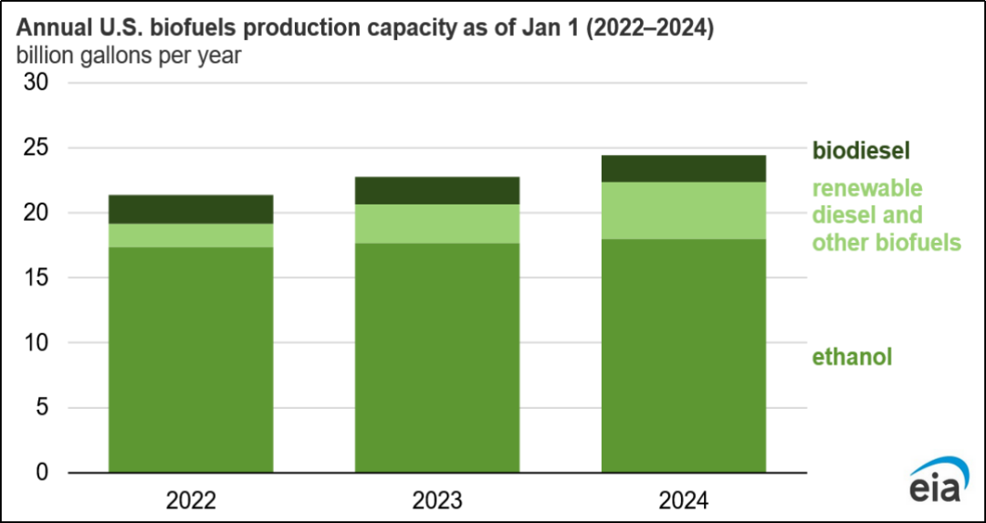 燃料乙醇依然是美国最主要的生物燃料,2024年初,美国生物燃料产能为240亿加仑/年,其中燃料乙醇的产能为180亿加仑/年,生物柴油的产能为21亿加仑/年,可再生柴油和其他生物燃料的产能为43亿加仑/年。