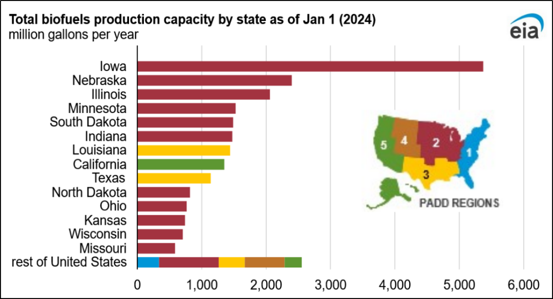 美国生物燃料产能集中在中西部、墨西哥湾沿岸和西海岸地区。产能排在第一位的是爱荷华州,其产能为54亿加仑/年,占总产能的22.5%,十四个主产州的产能接近总产能的90%。