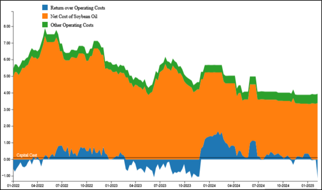 美国燃料乙醇利润表现一般。根据爱荷华州立大学农业和农村发展中心的数据显示,统计样本中的工厂盈利测算在2024年一季度的时候表现良好,不过二季度开始呈现收敛态势,进入2025年盈利测算进入负区间。整体来看,当前行业盈利水平对于行业增量推动不足。
