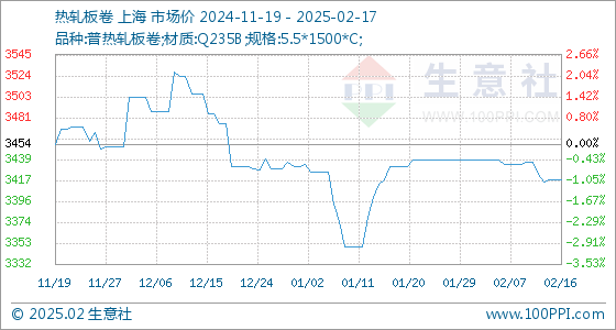 2月17日生意社热轧板卷基准价为3418.00元/吨