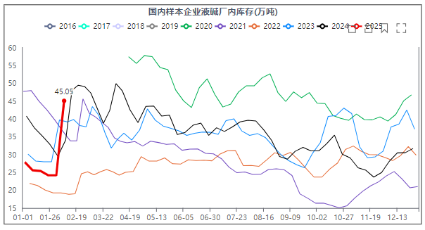 春节期间烧碱库存大幅累库,全国20万吨及以上液碱样本企业厂库库存45.05万吨,环比上调86.42%。库存方面由于累库幅度超过预期,导致市场情绪有所降温。