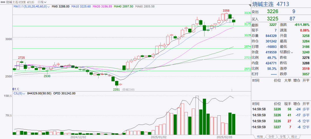 截至 2025 年 2 月 7日,烧碱主力合约收盘价为 3227元/吨,较上周下跌112元/吨,跌幅为-3.35%。