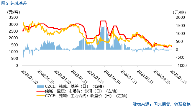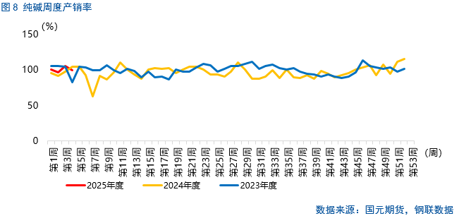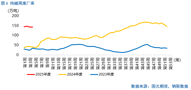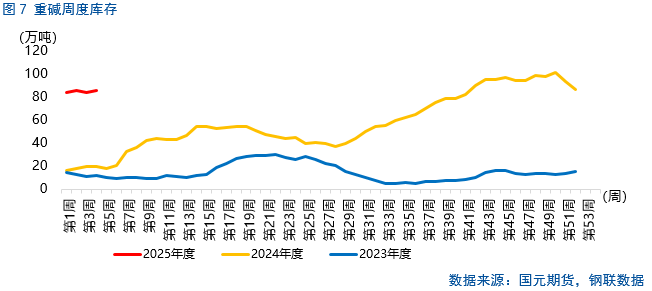 受到春节放假及物流停运的影响,纯碱出货量大幅下跌,库存显著积累。同比来看,绝对数量方面,2025年春节后首周纯碱累库41.56万吨,远高于2024年的25.80万吨,但2025年春节前后一周纯碱累库幅度却同比减少了超过30个百分点,缩至29.07%,这显示出2025年春节前纯碱库存的高基数效应。