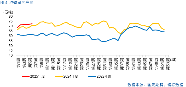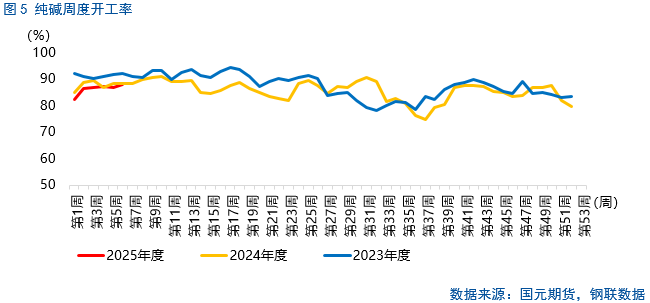 从数据上看,周内纯碱整体供应有所增加。截至2月6日,纯碱周度产量72.65万吨,环比增加0.80万吨,涨幅1.11%。其中,轻质碱产量31.44万吨,环比增加0.44万吨。重质碱产量41.21万吨,环比增加0.36万吨。截至2月6日,本周纯碱综合产能利用率88.04%,上周87.08%,环比增加0.96个百分点。其中氨碱产能利用率86.57%,环比持平,联产产能利用率85.12%,环比增加2.07个百分点。