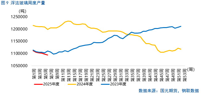 供应方面,浮法玻璃下周点火产线及放水产线并存,点火产线设计产能相对更高,但考虑到点火产线短期难以达产,整体产量或略有下滑。截至2月6日,浮法玻璃行业产能利用率为77.94%,与30日持平。本周浮法玻璃行业平均开工率76.35%,环比下降0.1个百分点;浮法玻璃行业平均产能利用率77.94%,环比降0.26个百分点。从产量上看,浮法玻璃日产量为15.62万吨,与30日持平。本周全国浮法玻璃产量109.37万吨,环比下跌0.33%,同比下跌8.74%。