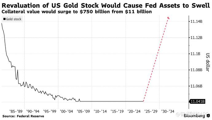 美国财政部目前可以将其实物黄金储备作为抵押,向美联储换取现金。这一提议最早在2023年就曾被提出,核心思想是政府应当将黄金储备的价值从当前的42.22美元/盎司(布雷顿森林体系遗留下来的价格)调整至市场价格。如果按照市场价格计算,美国财政部的黄金储备抵押价值将从目前约110亿美元跃升至约7500亿美元。