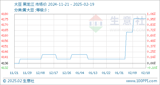 2月19日,生意社大豆基准价为4176.00元/吨,与本月初(4140.00元/吨)相比,上涨了0.87%。