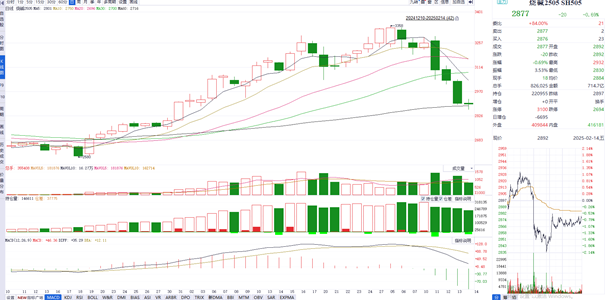 烧碱主力合约(SH2505合约)于2月5日冲高至3358高点后持续下跌至2月17日最低点2830,下跌幅度超15%。上周二以来持续五个交易日下跌,且2月11日、12日、13日单日跌幅均超2%,日内波动较大。截至2月17日,SH2505合约收盘价为2877,相比2月7日收盘价3227环比下跌10.8%。