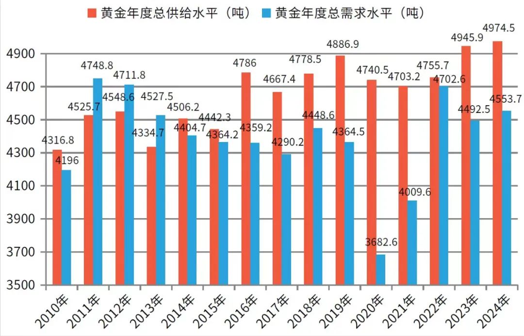 以年为单位来观测,2024年全年黄金全球总供给为4974.5吨,2024年全年黄金全球总需求为4553.7吨,供需差约为-420.7吨。全球央行的购金行动,远不能改变黄金供给大于需求的基本面结构,更多的是为短期“点燃”市场情绪有所助力。