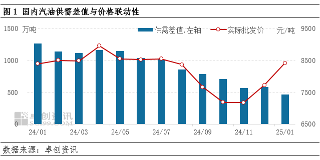 【导语】2025年1月,国内汽柴油供需差值走势保持差异性,汽油再度回归收缩趋势,柴油则在当前区间稳中小涨。汽、柴油本期批发均价不同幅度上涨,但究其原因受原油价格走势支撑显著,供需基本面带来的影响却十分有限。2月份,预计汽柴油两种产品的供需差值均存在收缩确实,不同之处是,柴油供需差值从高点向下实为有利影响,但汽油目前已处于低位,供小于求的局面或加剧。