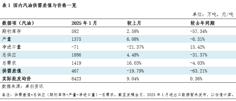 2025年1月炼厂提升产品收率,汽油总供应量环比增加4.48%。1月国内汽油总产量为1375万吨,环比增加6.08%;期初库存较上月增长2.58%;出口方面预估值有所增加,净进口量环比减少21.37%。产量的提升主要得益于国内炼油企业提升开工负荷,并且提前预判节前备采需求提升汽油收率,1月收率较上期增长超过1个百分点。另外,1月为国内炼油装置检修淡季,除部分独立炼厂因利润承压而主动降低负荷外,例行检修维护状况较少。叠加1月出口通道也重新“整装待发”,出口量将有所提升,整体导致了总供应量的增长。