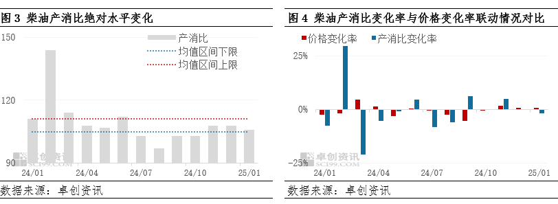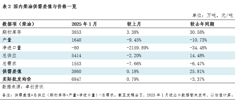 对比去年同期数据,2025年1月柴油供需差值同比增长25.81%,实际批发均价同比下降3.37%。柴油供需差值与批发价格在趋势上呈现反向联动规律,但价格受成本支撑,并未呈现与供需差值同等变化幅度。