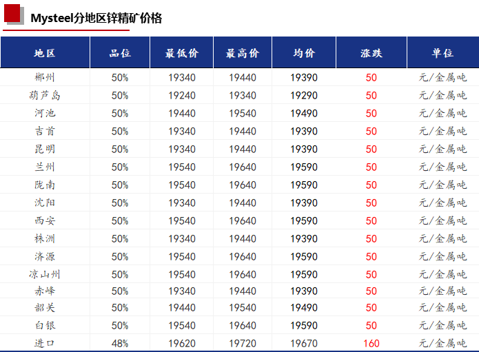 今日受锌价的影响,锌精矿价格上涨50元/金属吨。国内锌精矿加工费各地区暂无调整,和上一交易日持平。进口TC今日暂无变化,主流报价0-20美元/干吨。