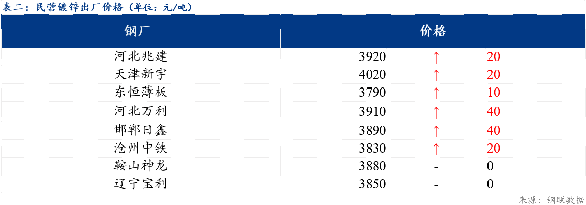 今日北方民营钢厂镀锌出厂指导价在3790元/吨-4020元/吨。
