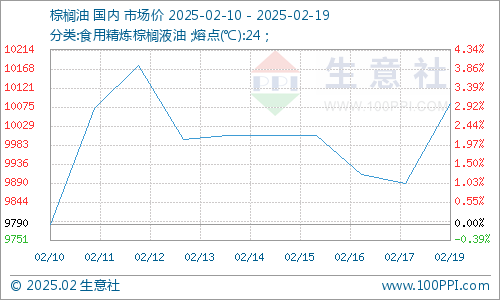 据生意社商品分析系统显示:2月10日以来,利多仍占主导,棕榈油行情振荡上涨为主。2月10日,棕榈油市场均价9790元/吨,2月19日,棕榈油市场均价10084元/吨,上涨3%。