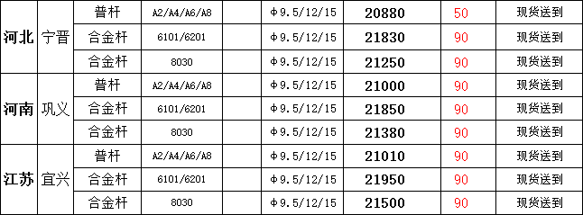 2月19日宁晋市场普铝杆现货报盘价20880元/吨,较上一交易日报价涨50元/吨;巩义市场普铝杆现货报盘价21000元/吨,较上一交易日报价涨90元/吨;宜兴市场普铝杆报盘价21010元/吨,较上一交易日报价涨90元/吨。