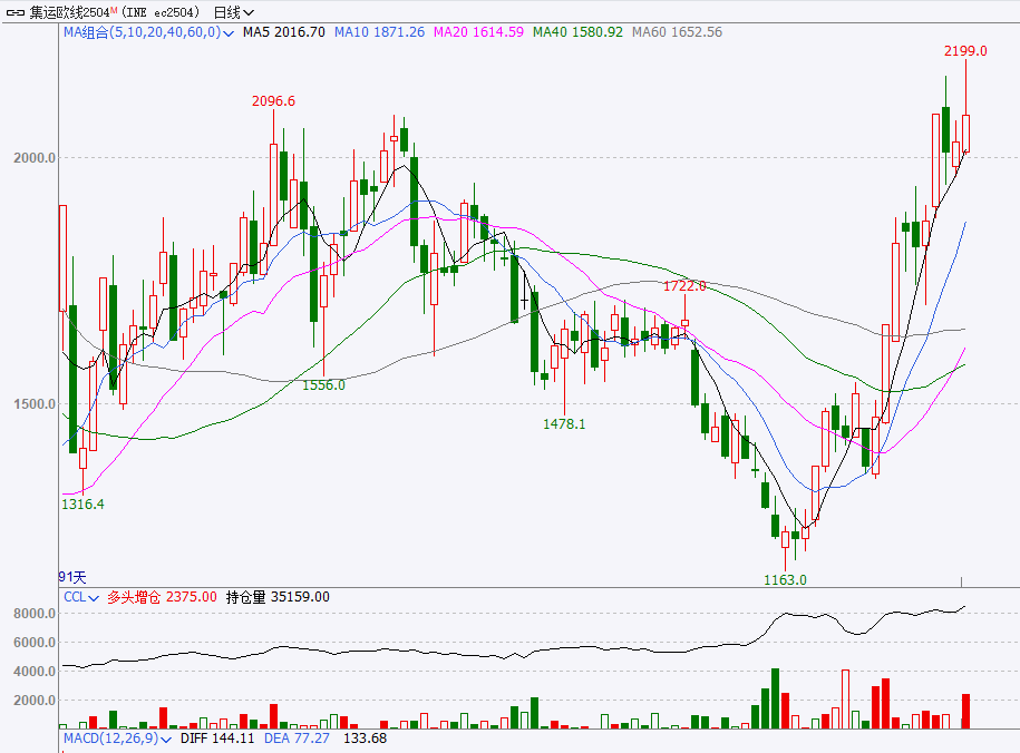 今日集运市场多空分歧仍存,日内大量多配资金涌入推动期价探高,尾盘部分多头止盈离场,造成集运盘面小幅下跌。今日集运主力合约收于2084.4点,涨幅为3.4%。