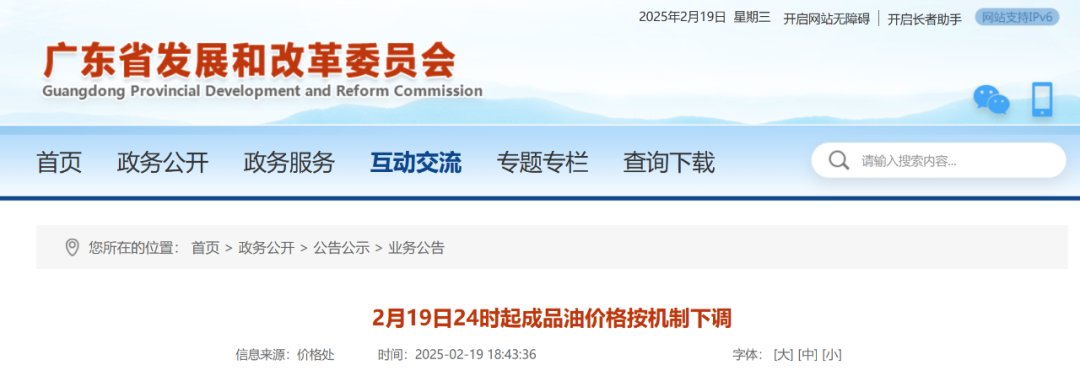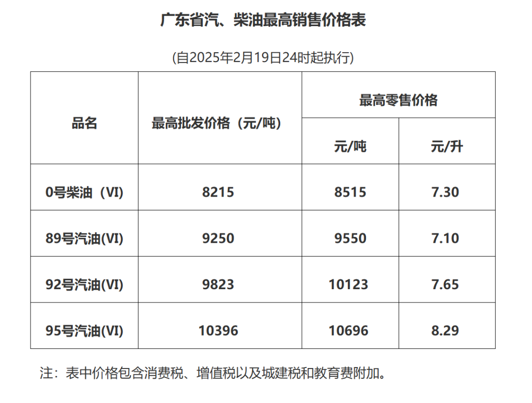 根据广东省发展和改革委员会公告,2月19日24时起成品油价格按机制下调。