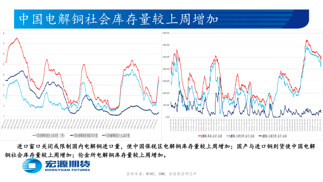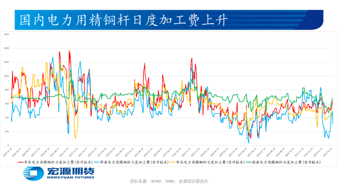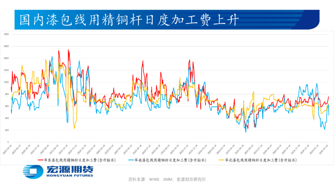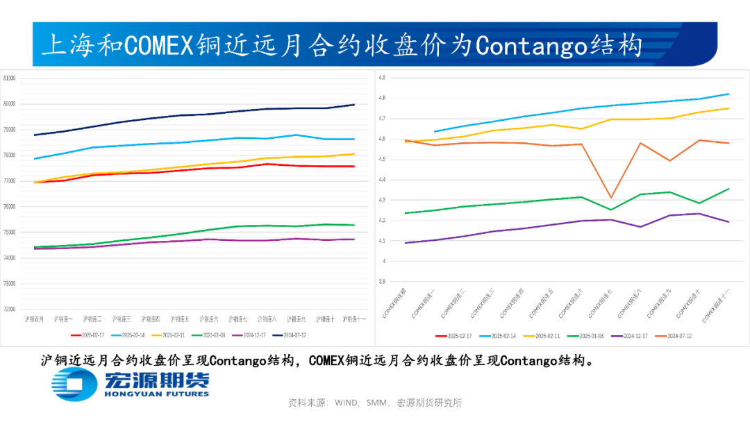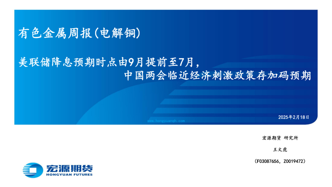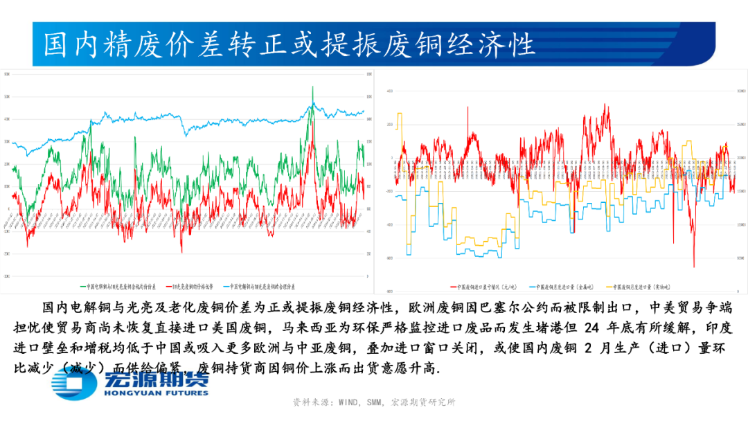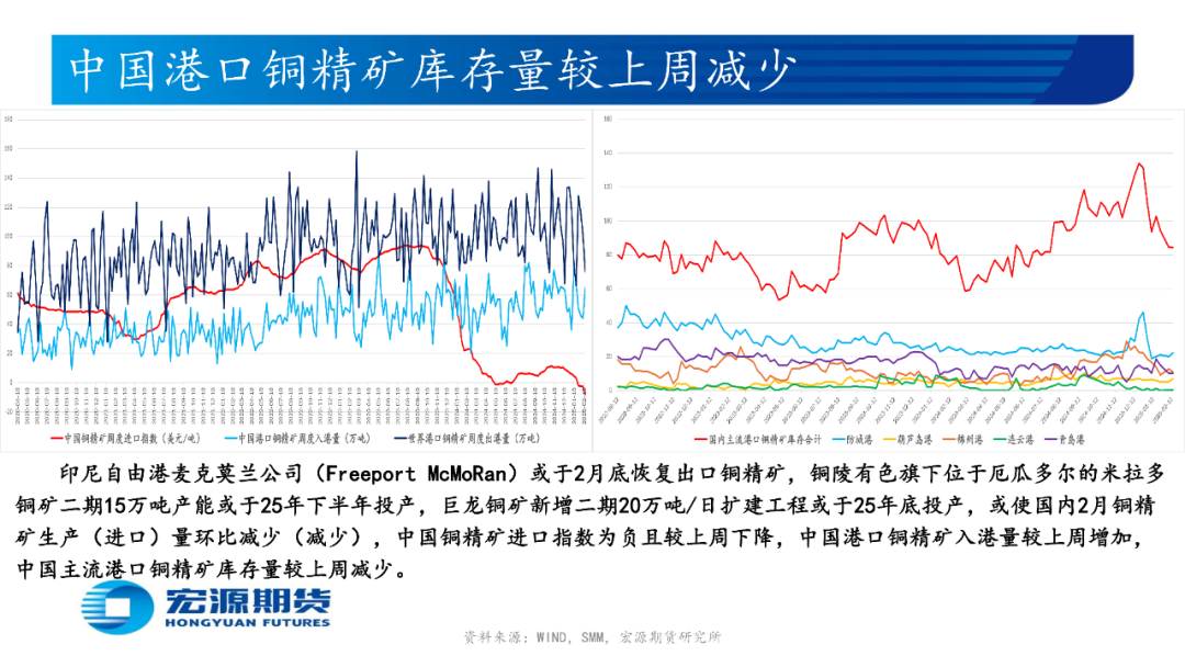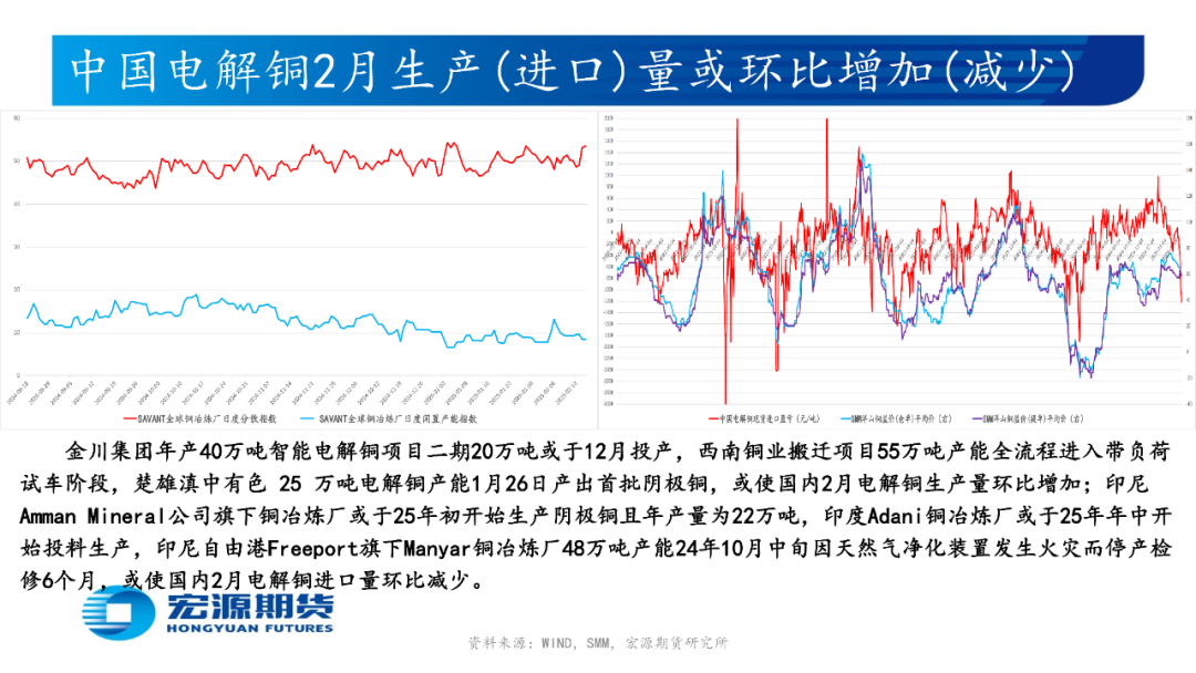 印尼自由港麦克莫兰公司(Freeport McMoRan)或于2月底恢复出口铜精矿,铜陵有色旗下位于厄瓜多尔的米拉多铜矿二期15万吨产能或于25年下半年投产,巨龙铜矿新增二期20万吨/日扩建工程或于25年底投产,或使国内2月铜精矿生产(进口)量环比减少(减少);国内电解铜与光亮及老化废铜价差为正或提振废铜经济性,中国北方(南方)粗铜周度加工费环比升高(升高),或使国内粗铜2月生产量(进口量)环比减少(减少)而供需预期趋松;西南铜业搬迁项目55万吨产能全流程进入带负荷试车阶段,楚雄滇中有色25万吨电解铜产能1月26日产出首批阴极铜,或使国内2月电解铜生产量环比增加,但国内3月或有98万吨电解铜产能开始检修;印尼Amman Mineral公司旗下铜冶炼厂或于25年初开始生产阴极铜且年产量为22万吨,印度Adani铜冶炼厂或于 25 年年中开始投料生产,印尼自由港Freeport旗下Manyar铜冶炼厂48万吨产能24年10月中旬因天然气净化装置发生火灾而停产检修6个月,或使国内2月电解铜进口量环比减少;