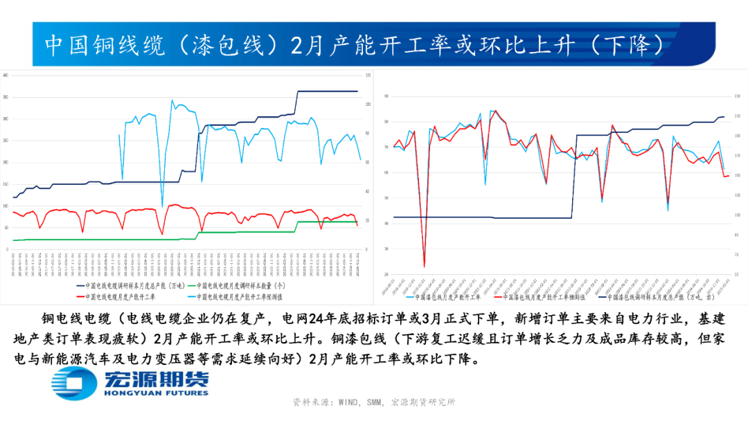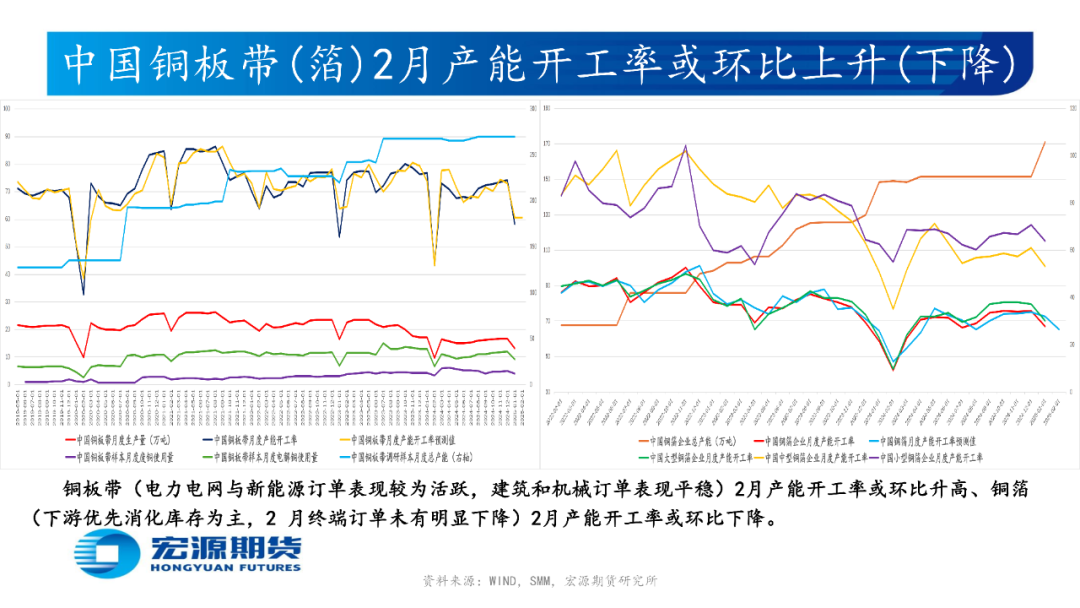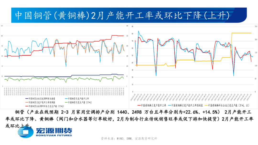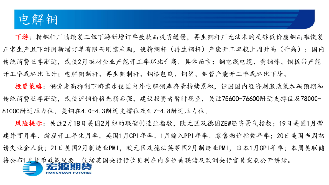 精铜杆厂陆续复工但下游新增订单疲软而提货缓慢,再生铜杆厂无法采购足够低价废铜而难恢复正常生产且下游因新增订单有限而刚需采购,使精铜杆(再生铜杆)产能开工率较上周升高(升高);国内传统消费旺季渐近,或使2月铜材企业产能开工率环比升高,具体而言:铜电线电缆、黄铜棒、铜板带产能开工率或环比上升;电解铜制杆、再生铜制杆、铜漆包线、铜箔、铜管产能开工率或环比下降。