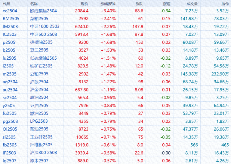 沪深300股指期货(IF)主力合约涨0.57%,上证50股指期货(IH)主力合约涨0.45%,中证500股指期货(IC)主力合约涨1.68%,中证1000股指期货(IM)主力合约涨2.26%。