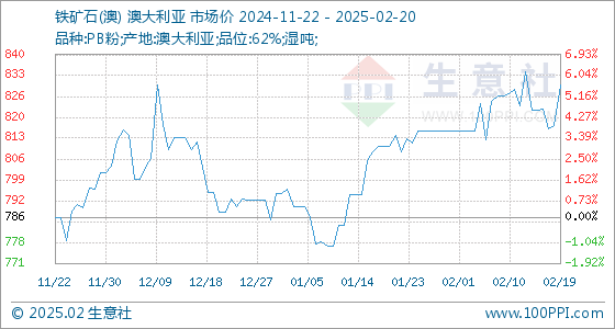 2月20日,生意社铁矿石(澳)基准价为830.67元/吨,与本月初(815.44元/吨)相比,上涨了1.87%。
