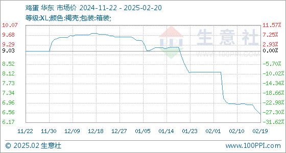 2月20日,生意社鸡蛋基准价为6.50元/公斤,与本月初(8.20元/公斤)相比,下降了-20.73%。