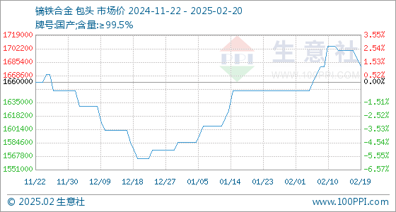 2月20日,生意社镝铁合金基准价为1680000.00元/吨,与本月初(1650000.00元/吨)相比,上涨了1.82%。
