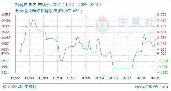 2月20日,生意社棕榈油基准价为10084.00元/吨,与本月初(9430.00元/吨)相比,上涨了6.94%。