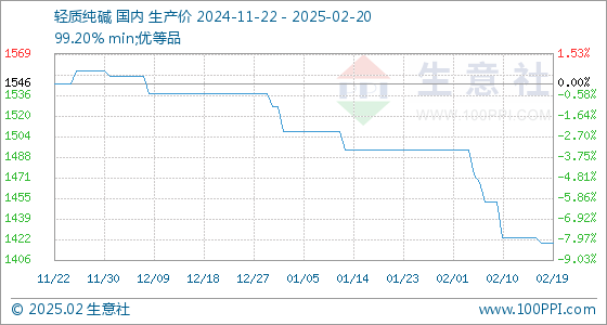 2月20日,生意社轻质纯碱基准价为1420.00元/吨,与本月初(1494.00元/吨)相比,下降了-4.95%。